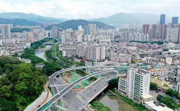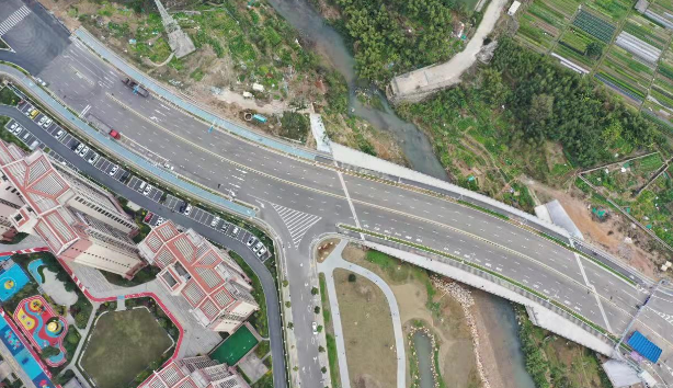 羅橋節(jié)點(diǎn)改造提升工程2019年11月開(kāi)工建設(shè),2021年8月建成通車。該項(xiàng)目沿北環(huán)西路、龍興路設(shè)置南北分離式雙向四車道高架,南側(cè)接龍興路,北側(cè)接現(xiàn)狀北環(huán)西路,高架靠東側(cè)布置(緊貼烈士陵園),橋梁總長(zhǎng)約1140米,凈寬約7.7米;在雙洋路、龍川北路、北環(huán)西路設(shè)置人行天橋,與山體步道銜接,以完善慢行系統(tǒng);在烈士陵園山體下采用明挖回填方式設(shè)置框涵,長(zhǎng)度約225米,凈寬10.75米。工程投資1.4億元。